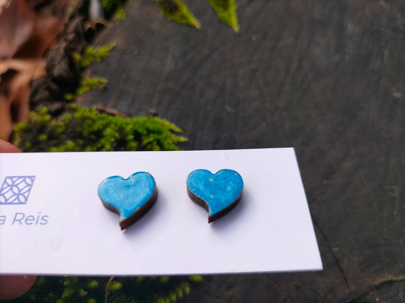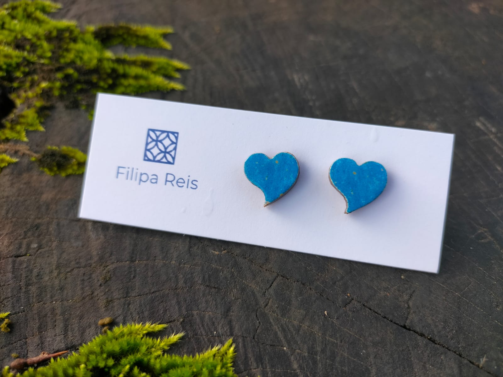 • Brincos em forma de coração azul em cartão branco com logótipo 'Filipa Reis' sobre madeira com musgo