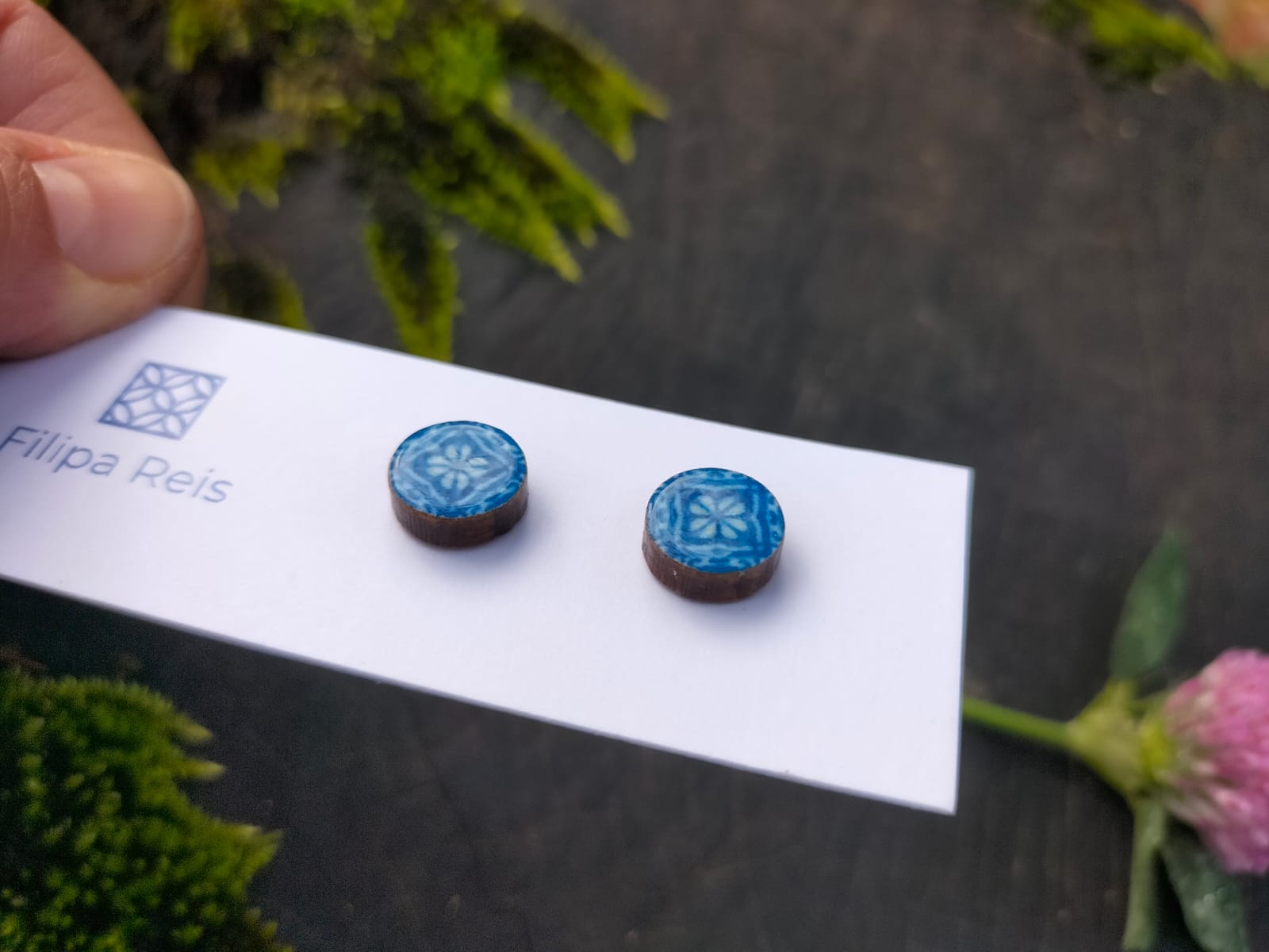 • Brincos redondos azuis com padrão floral em cartão branco com texto Filipa Reis